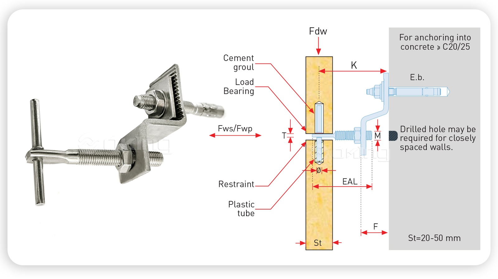 | K (mm) | K - (mm) | K (mm) | Fdw (N) | F (mm) | Fwp (N) | Fws (N) | E.b. (mm) | ф (mm) | M (mm) | T (mm) | EAL(mm) | |